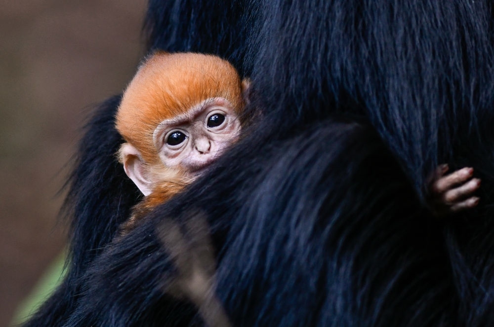 在貴州麻陽河國家級自然保護(hù)區(qū)拍攝的黑葉猴幼猴(4月30日攝)。新出生的黑葉猴毛色呈金黃色,幾個(gè)月后逐漸變成黑色。