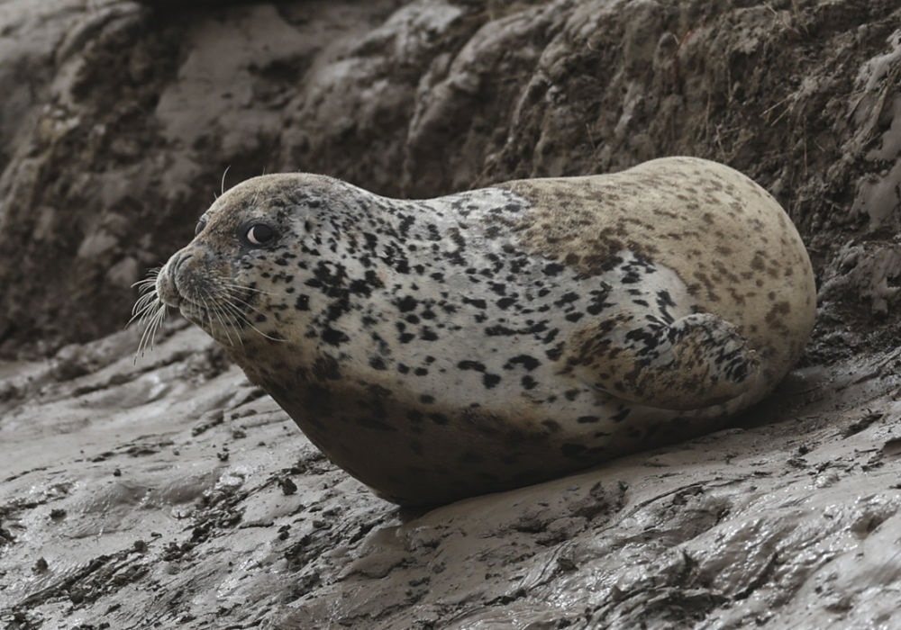 4月13日,西太平洋斑海豹在遼寧盤錦三道溝海域的灘涂上休息。