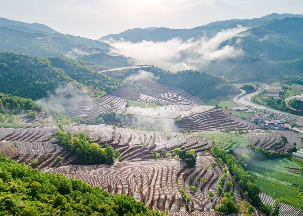 陜西省漢中市略陽縣郭鎮(zhèn)譚家莊村綜合治理后的梯田(4月26日攝,無人機(jī)照片)。