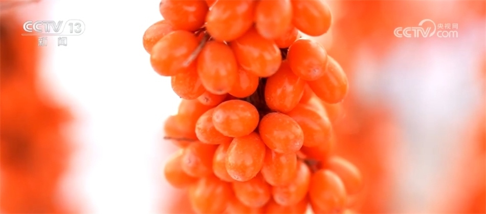 總臺記者 崔寧:我現(xiàn)在是在新疆生產(chǎn)建設(shè)兵團(tuán)第九師170團(tuán)的萬畝沙棘種植基地。這些小果就是已經(jīng)成熟的沙棘,我們來看,密密麻麻的,有黃豆大小,顏值非常高。我們平時熟悉的沙棘飲料、沙棘果油就是由它來生產(chǎn)的。沙棘的品種有很多,像我們現(xiàn)在看到的這種叫做大果沙棘,產(chǎn)量相對來說比較高,每畝地能夠達(dá)到平均800公斤。