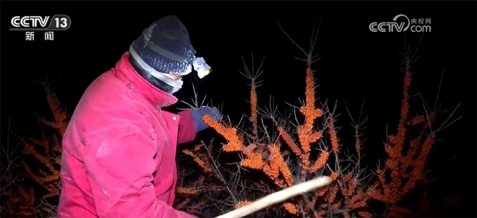 因為沙棘中含有大量的沙棘油,所以要想讓它凍到能敲下來的程度,就必須要等到氣溫非常低的時候,因此種植戶通常會選擇在最冷的季節(jié)、最冷的寒夜來采收,當(dāng)?shù)厝税阉凶觥扒霉薄?/p>