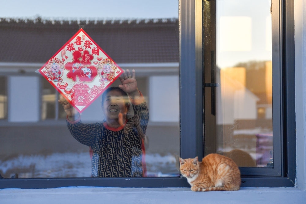 吉林省舒蘭市開(kāi)原鎮(zhèn)新開(kāi)村村民徐中仁在新房子中貼“?!弊郑?2月7日攝)。新華社記者 許暢 攝