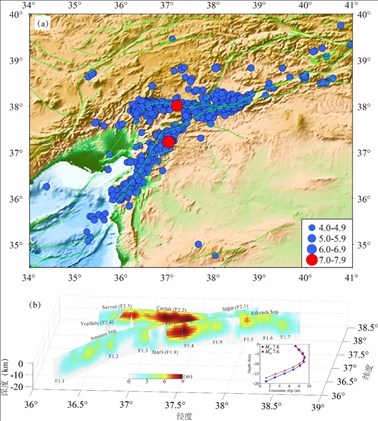 土耳其兩次7.8級地震及其余震分布(a)和兩次主震的滑動位移分布(b)