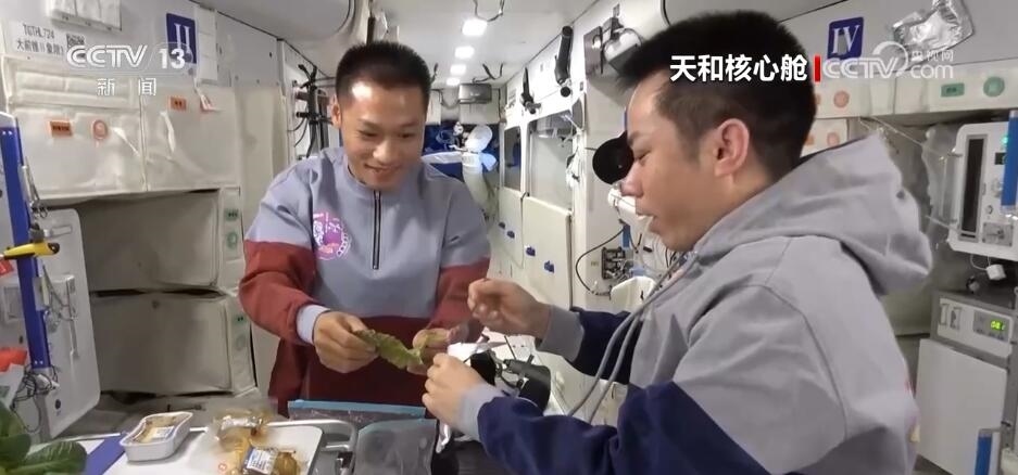 航天員 江新林:我是今天的太空美食家,讓我?guī)ьI(lǐng)大家一起來探索發(fā)現(xiàn)今天的太空美食。我們先看一下主食,熱乎乎的,看看里面都有什么吧,有01最愛吃的白米飯,小心燙哦,02愛吃的面條,我的炒飯。好了,把它粘在餐桌上。然后再讓我們看看我為他們準(zhǔn)備的驚喜??纯催@是什么?這是我們冬至特意結(jié)余的餃子,還有蔬菜副食。地面上的工作人員考慮得特別周到,按照個(gè)人的口味為我們準(zhǔn)備了美味的食品,而且將它們塑封包裝,給我們節(jié)余時(shí)間的時(shí)候又保證它的口味。這是網(wǎng)紅太空香粽,大家印象比較深刻吧,還有這個(gè)年糕也是特別好吃、特別美味,還有紅燴豬排,保證有足夠的蛋白質(zhì)攝入量。很豐盛。請看這里,我們特意留了一些新鮮的水果,看看都有什么吧,有美味的蘋果,還有葡萄,大家這個(gè)都特別愛吃,我們?nèi)齻€(gè)在一起分享一下。