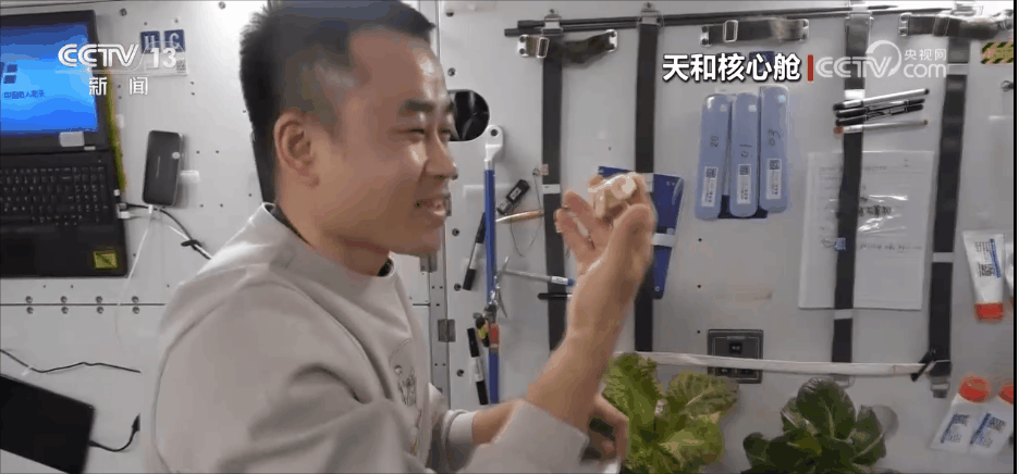 航天員 唐勝杰:你好,我正在對我們的櫻桃番茄進(jìn)行授粉。因?yàn)樘諞]有小蜜蜂,我就是那只小蜜蜂。大家看一看,這是我們的太空蔬菜,神十七乘組在“太空出差”期間,我們的太空菜園變得更大了,大家看看我們的蔬菜是不是長勢喜人?今天是新年的第一天,江新林為我們準(zhǔn)備了營養(yǎng)豐盛的太空午餐,但是我覺得今天應(yīng)該再增加一點(diǎn)綠色的、新鮮的蔬菜,午餐就會變得更豐盛了。大家可以看一看,看看我們的櫻桃番茄。誒,拿這兩杯,今天中午我們就吃這兩杯。