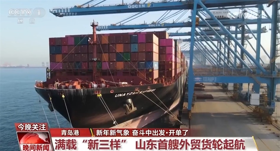 新年伊始,山東首艘外貿(mào)貨輪從青島港起航。3500多個標箱里滿載包括電動載人汽車、鋰離子蓄電池、太陽能電池等外貿(mào)“新三樣”,總貨值約2億人民幣。