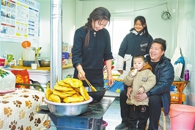 1月3日,王春梅(左一)在安置房里炸油餅。本報(bào)記者 賀勇攝