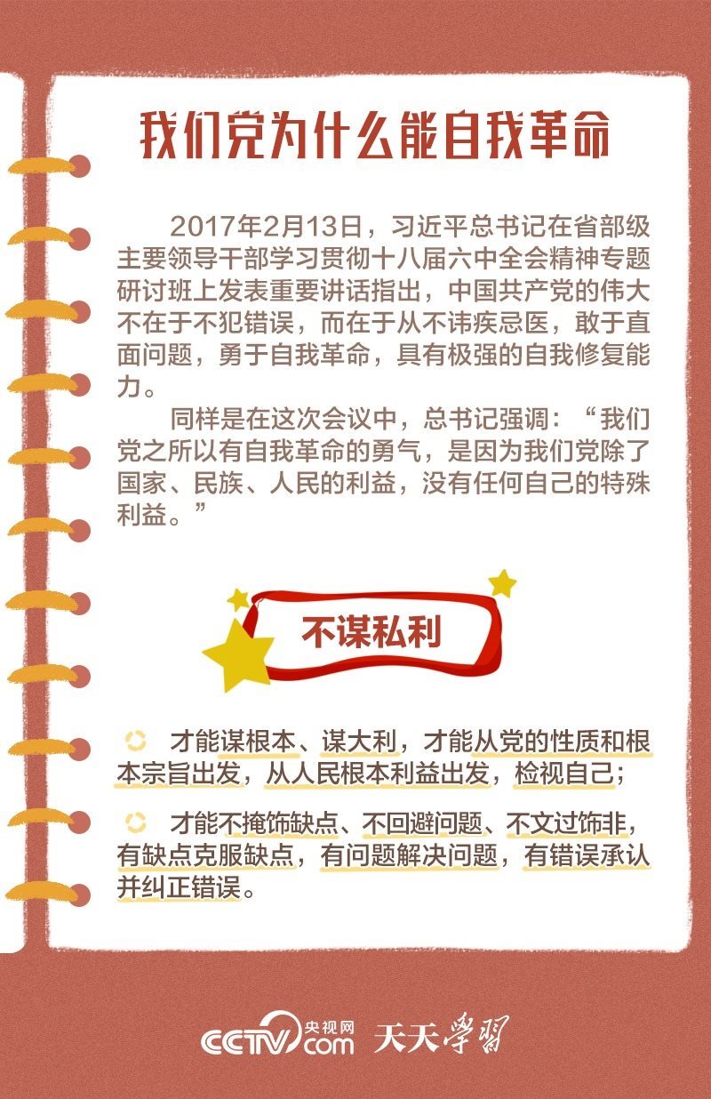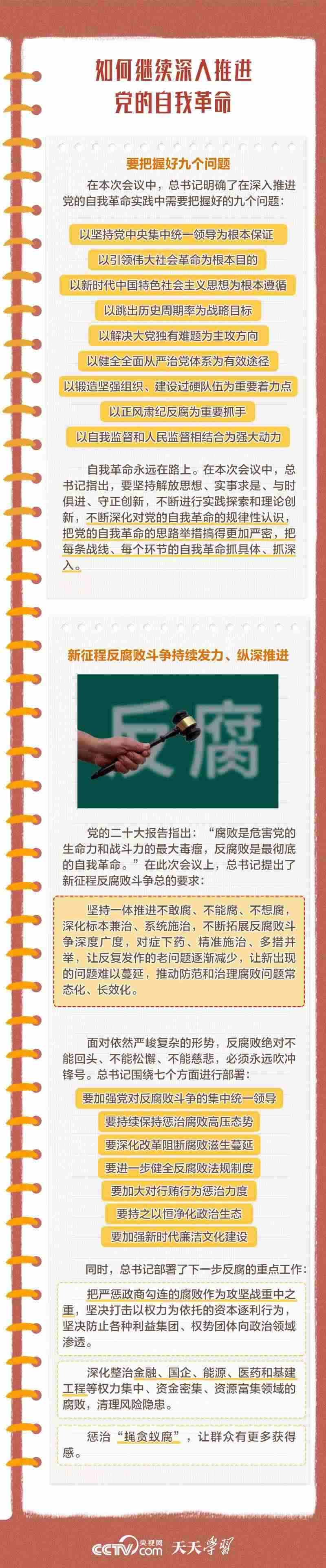 勇于自我革命是我們黨最鮮明的品格和最大的優(yōu)勢(shì),總書(shū)記多次對(duì)推進(jìn)黨的自我革命作出重要部署。此次會(huì)議上,總書(shū)記深刻闡述了黨的自我革命的重要思想,明確提出需要把握好九個(gè)問(wèn)題,并對(duì)持續(xù)發(fā)力、縱深推進(jìn)反腐敗斗爭(zhēng)作出戰(zhàn)略部署。央視網(wǎng)《天天學(xué)習(xí)》與您一起學(xué)習(xí)。