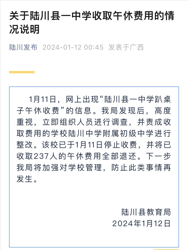 ·廣西陸川一中學(xué)收取“趴桌費(fèi)”?當(dāng)?shù)亟逃郑贺?zé)成學(xué)校整改,已退還全部費(fèi)用。