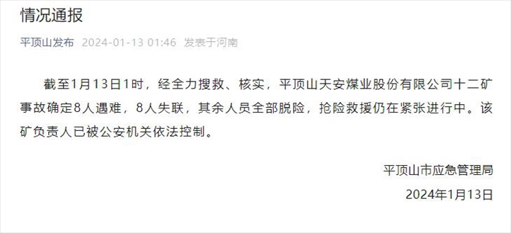 ·河南平頂山煤礦事故已致8人遇難8人失聯(lián),該礦負(fù)責(zé)人已被控制。
