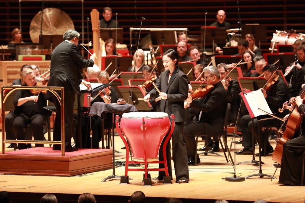 1月12日,在美國費城,上海交響樂團(tuán)打擊樂演奏家付藝霏(中)在2024年費城交響樂團(tuán)新春音樂會上演出。