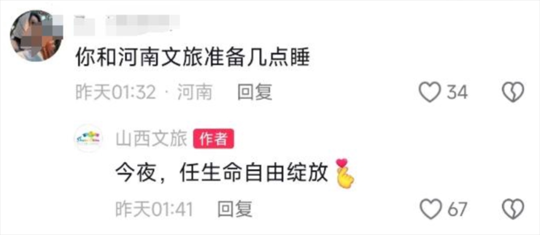有網(wǎng)友稱“河南文旅按小時(shí)發(fā),咱們山西按分鐘發(fā)”,“山西文旅你勤快得讓我有點(diǎn)陌生”,凌晨,山西文旅小編仍在與網(wǎng)友互動(dòng)——