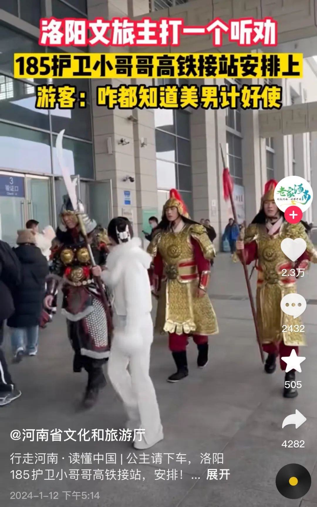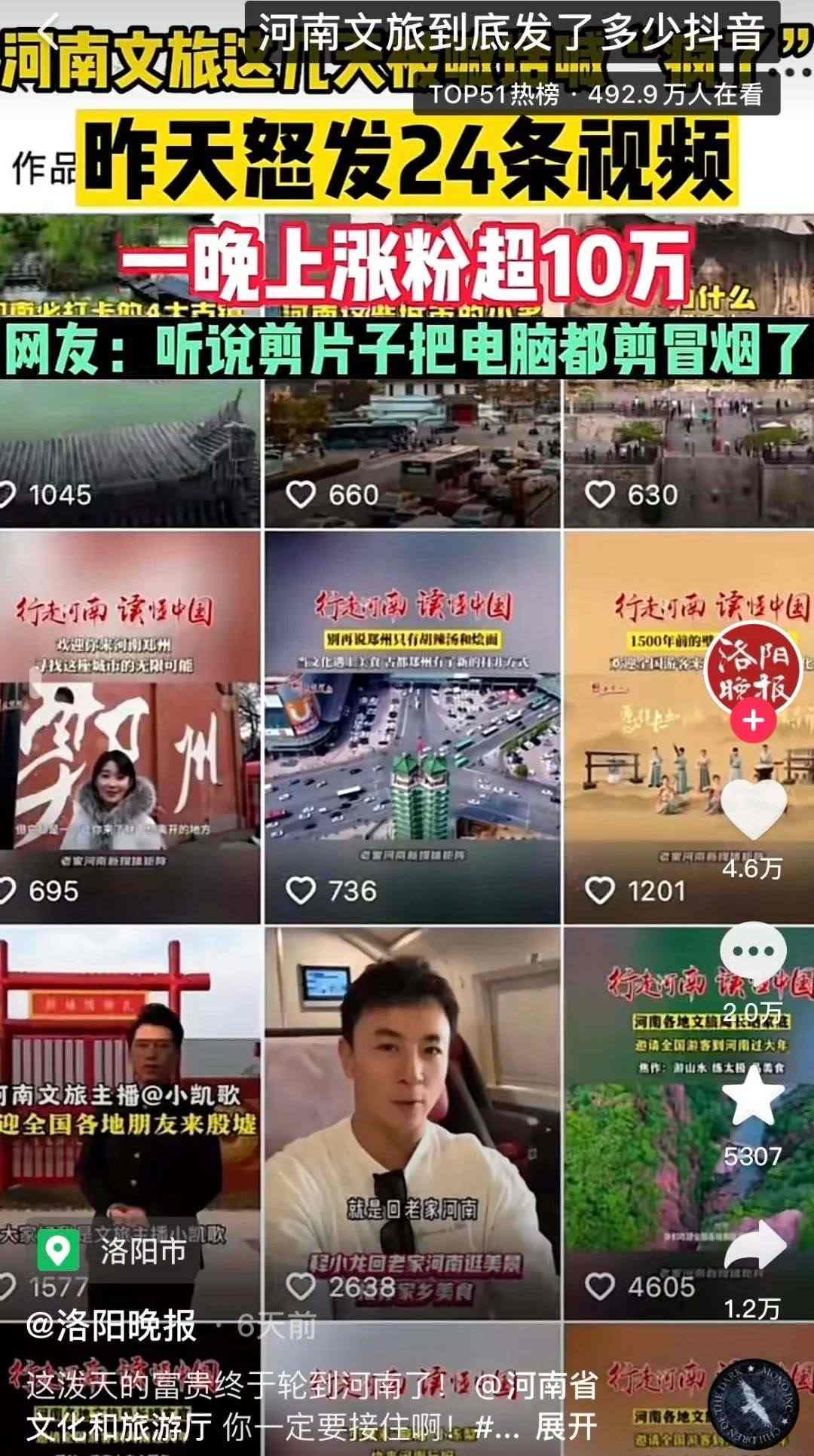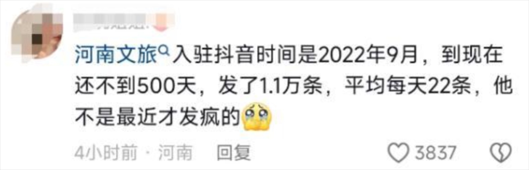 有人統(tǒng)計(jì),自1月9日起,河南文旅官方賬號(hào)“河南省文化和旅游廳”每天發(fā)布二三十條視頻,連續(xù)四天發(fā)布了112條視頻,持續(xù)展示本地文旅資源,吸引了近百萬新粉絲,主打一個(gè)“量變總會(huì)引起質(zhì)變”,以至于“河南文旅到底發(fā)了多少抖音”相關(guān)話題成為熱門搜索。