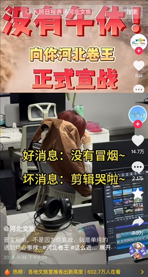 有網(wǎng)友建議賬號(hào)改名為“河北文旅”,“不然都搜不到”,“聽勸”的官方賬號(hào)火速改名,并發(fā)布視頻“宣戰(zhàn)”,“山河四省互不內(nèi)卷?xiàng)l約正式結(jié)束,今天這個(gè)卷王我當(dāng)定了”,于是開始“瘋狂輸出”,日更75條,可還了得?