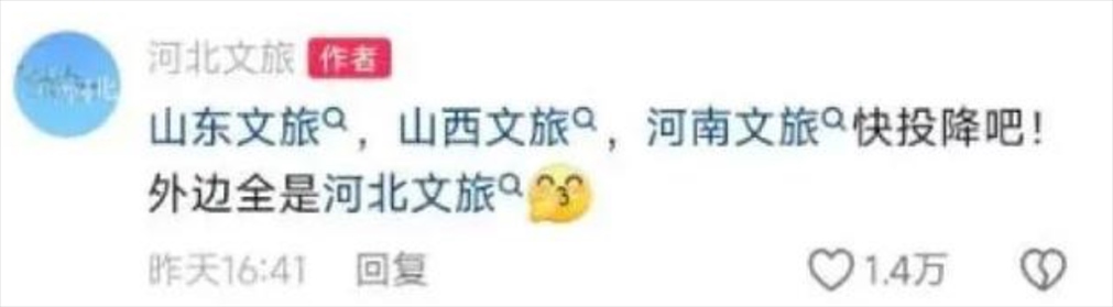此前,山西、河南宣布結(jié)成“旅游搭子”,豫晉六城114家A級(jí)景區(qū)門票互免,見河南文旅“悄悄努力驚艷所有人”,山西文旅“醋壇子立馬打翻了”,直接喊麥……