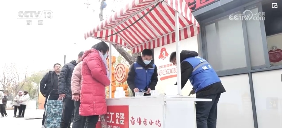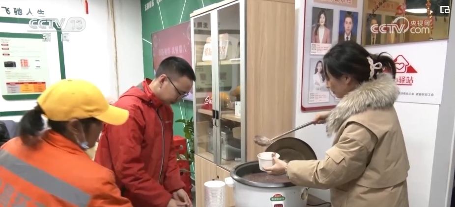 在湖北武漢武昌區(qū)一家工會驛站里,工會組織和街道也專門為外賣員、快遞員和環(huán)衛(wèi)、城管工作人員等戶外勞動者們,熬制了一大鍋臘八粥。