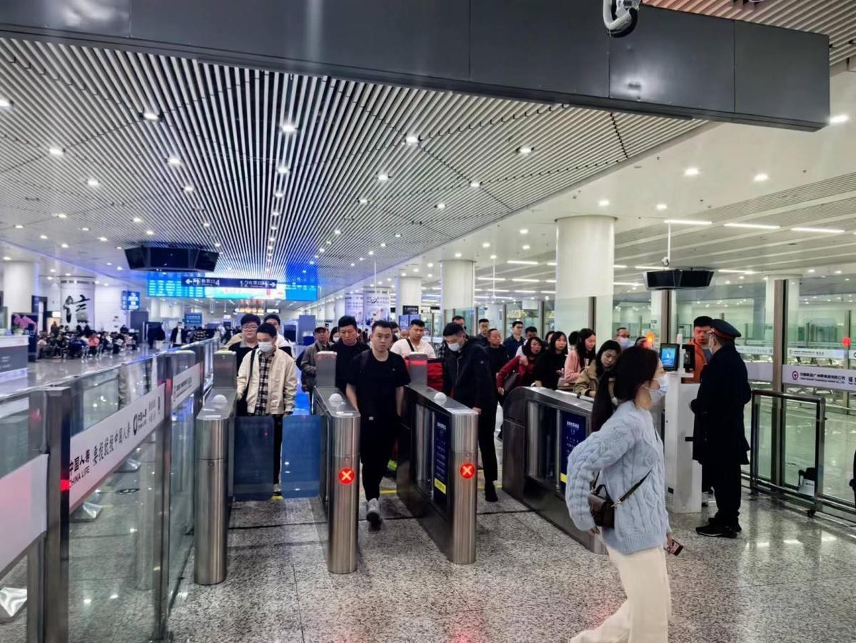 福田站旅客正排隊(duì)通過進(jìn)站閘機(jī)口。 (攝影:戴林)
