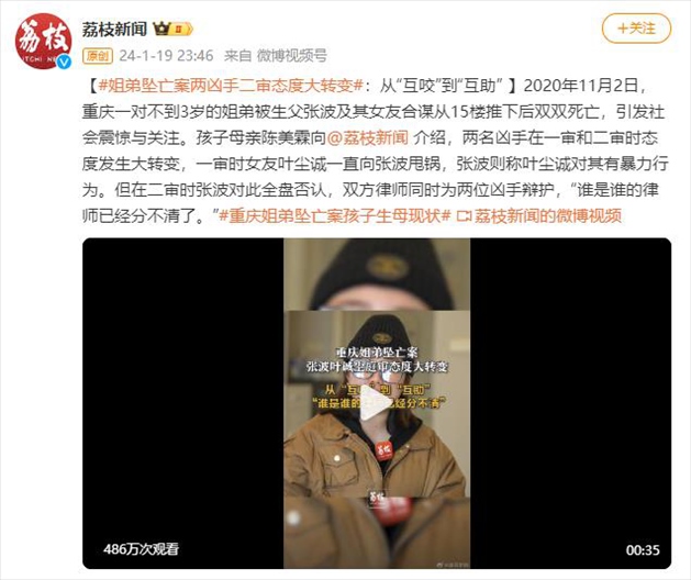 ·重慶姐弟墜亡案孩子母親陳美霖近日向媒體介紹,兩名兇手在一審和二審時態(tài)度發(fā)生大轉(zhuǎn)變,一審時女友葉塵誠一直向張波甩鍋,張波則稱葉塵誠對其有暴力行為。但在二審時張波對此全盤否認,雙方律師同時為兩位兇手辯護,“誰是誰的律師已經(jīng)分不清了?!?/p>