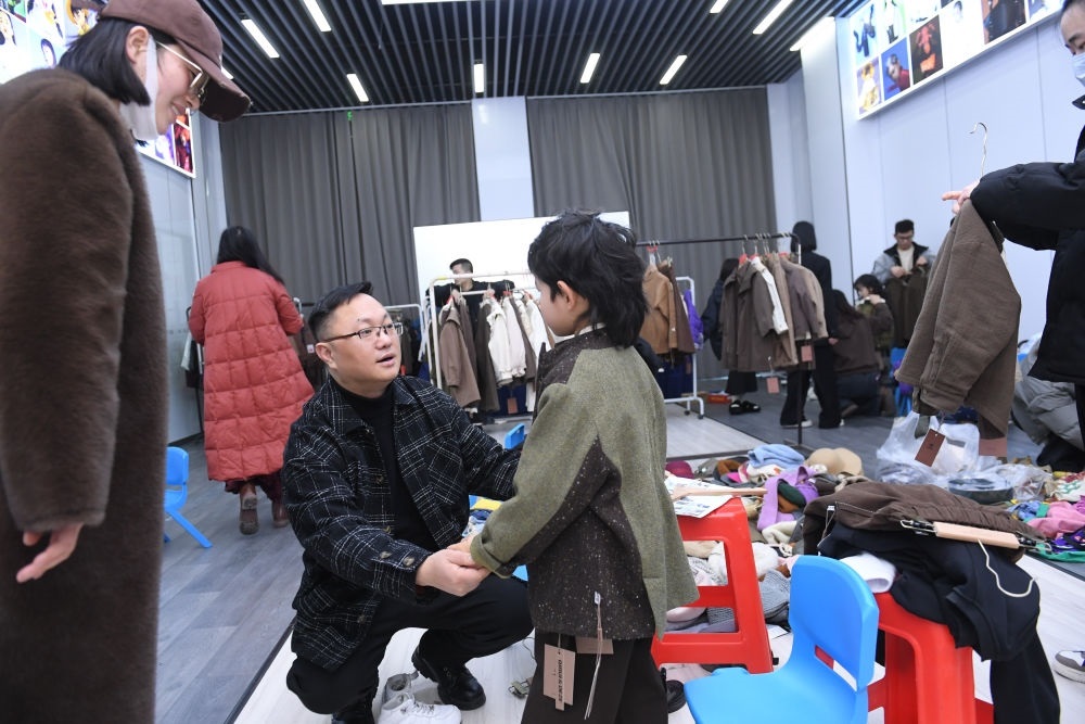 2024年1月17日,在位于浙江省湖州市織里鎮(zhèn)的萬(wàn)順服飾股份有限公司,工作人員(前左二)在品牌的2024秋季新品審版會(huì)后臺(tái)和小模特交流??椑镦?zhèn)是中國(guó)最大的童裝產(chǎn)業(yè)集群地,聚集著1.4萬(wàn)家童裝企業(yè)。新華社記者 翁忻旸 攝