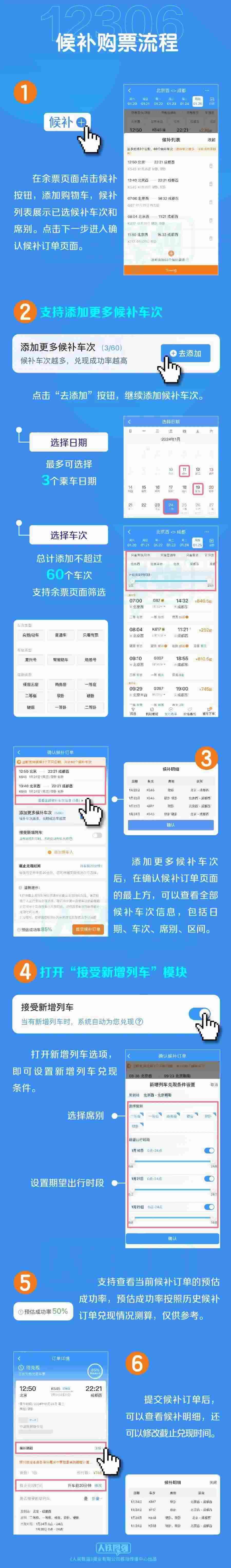 四是臨時(shí)新增旅客列車席位優(yōu)先配售給已提交候補(bǔ)訂單的旅客。旅客在提交候補(bǔ)訂單時(shí),可選擇接受購(gòu)買符合出行需求的新增旅客列車車票,如鐵路部門臨時(shí)新增旅客列車,在車票起售時(shí),鐵路12306將自動(dòng)優(yōu)先配售給已提交候補(bǔ)訂單的旅客,旅客無(wú)需人工查詢?cè)鲩_列車信息再購(gòu)票。