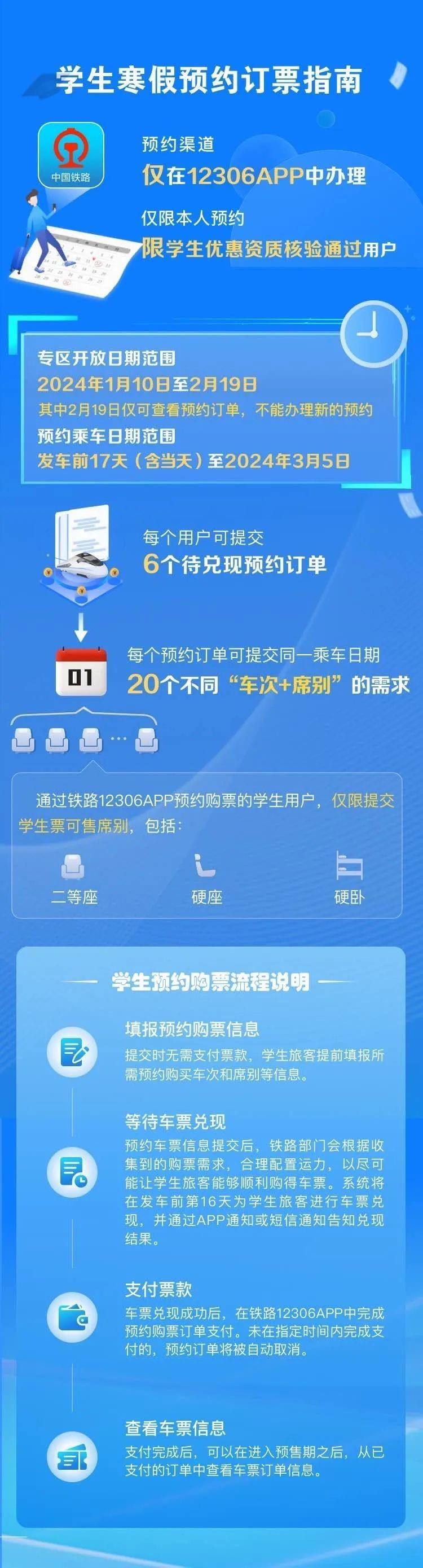 學(xué)生、務(wù)工人員通過(guò)鐵路12306專區(qū)購(gòu)買春運(yùn)期間火車票,可提交開車前17天(含)以上的出行購(gòu)票需求,最晚可預(yù)約3月5日的車票。符合條件的旅客朋友可在開車前17天23時(shí)前在12306手機(jī)客戶端提交購(gòu)票需求,在開車前16天查詢兌現(xiàn)結(jié)果,須在開車前第16天23時(shí)前,通過(guò)12306手機(jī)客戶端預(yù)約專區(qū)支付票款,逾期未支付的,訂單自動(dòng)取消;兌現(xiàn)成功后逾期未支付達(dá)到5次的,不再提供預(yù)約購(gòu)票服務(wù)。