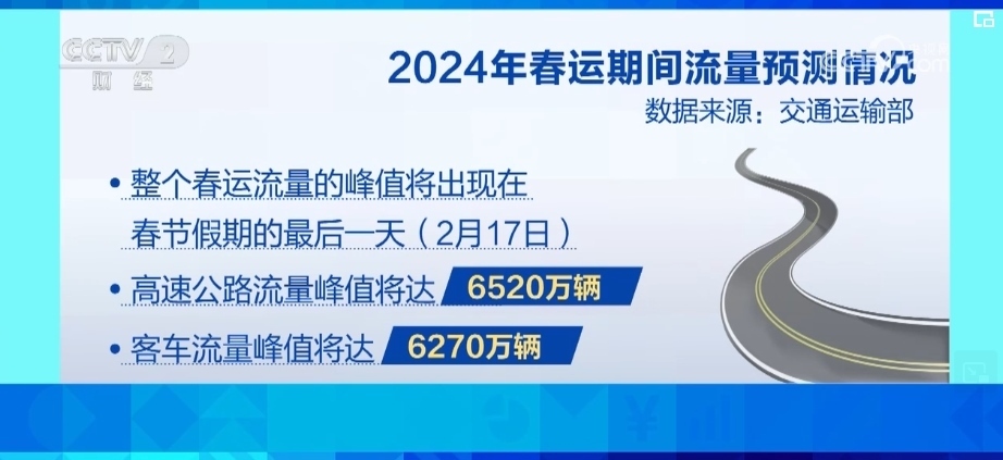 交通運(yùn)輸部預(yù)計(jì),2024年春運(yùn)期間,全國(guó)公路網(wǎng)日均流量將達(dá)3720萬(wàn)輛,比2023年同期增長(zhǎng)7.5%。整個(gè)春運(yùn)流量的峰值將出現(xiàn)在春節(jié)假期的最后一天,也就是2月17日,高速公路流量峰值將達(dá)6520萬(wàn)輛,客車(chē)流量峰值將達(dá)6270萬(wàn)輛。