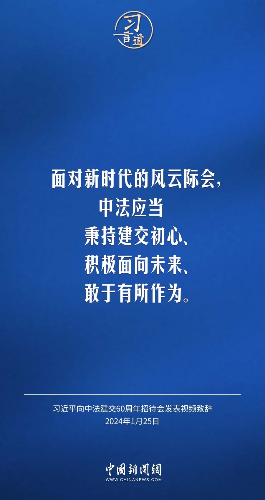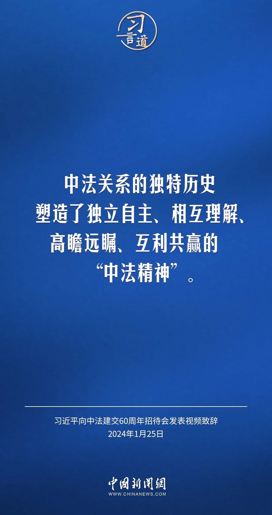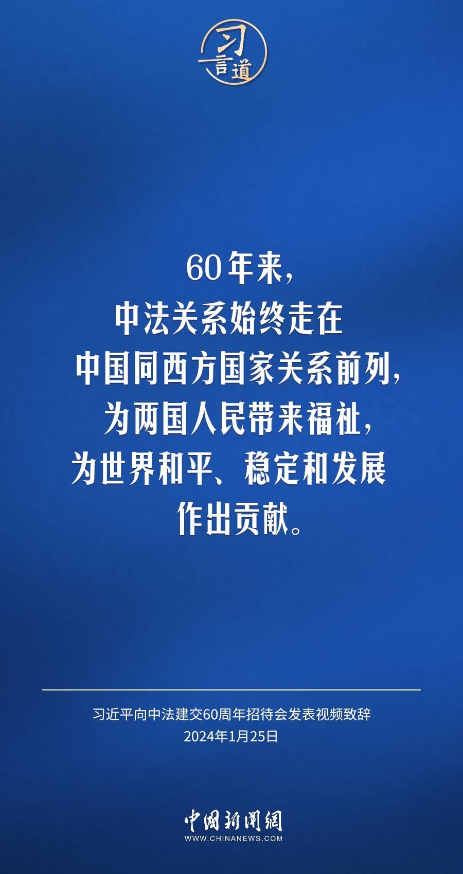 1月25日,中法建交60周年招待會在國家大劇院舉行,國家主席習(xí)近平發(fā)表視頻致辭。習(xí)近平指出——