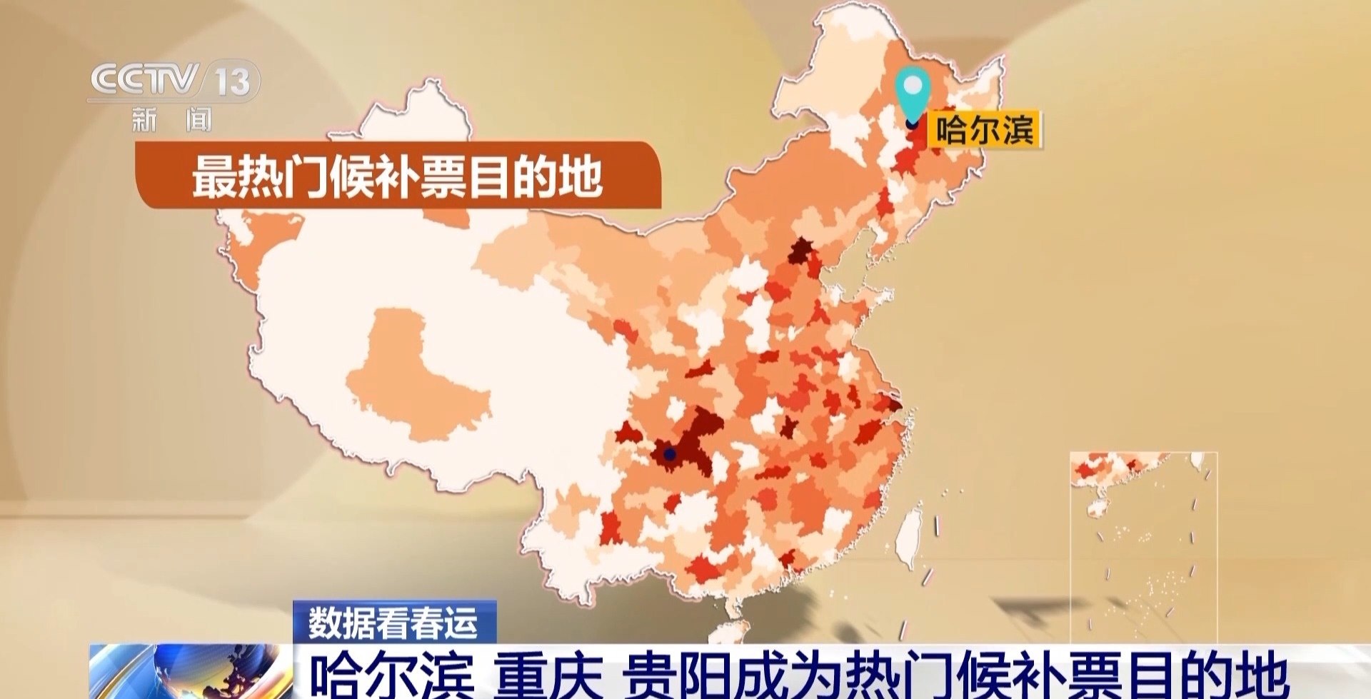 根據(jù)12306數(shù)據(jù)平臺(tái)的候補(bǔ)票情況看,目前哈爾濱成為最熱門(mén)的候補(bǔ)票目的地。哈爾濱不單單吸引南方人,天津、北京、廣州、沈陽(yáng)這四個(gè)城市到哈爾濱的候補(bǔ)票數(shù)量也是排名靠前。此外,重慶和貴陽(yáng)也是頗為熱門(mén)的候補(bǔ)票目的地,從廣州、深圳、東莞去往重慶和貴陽(yáng)的車(chē)票也很搶手。