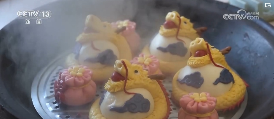 在黑龍江樺南縣,為了圖個(gè)熱鬧、沾個(gè)喜氣,誰(shuí)家蒸花饃,鄉(xiāng)里鄉(xiāng)親都會(huì)前來幫忙。在村民張瑞雪家里,大家圍坐在桌前,小小面團(tuán)通過“一印、二捏、三鑲”等技法,再起鍋開蒸,就變成了精美的龍年花饃。這些花饃形態(tài)各異,有的威武雄壯、有的憨態(tài)可掬,不僅外觀吸引人,更承載著美好的新年祝福。