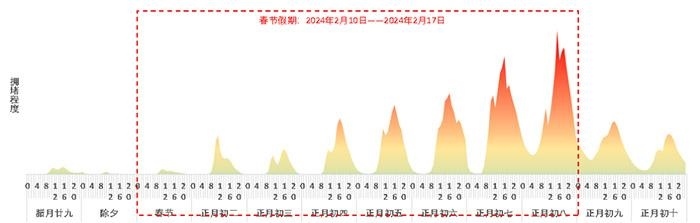 此外,春節(jié)期間出程與節(jié)日后期返程的潮汐特征明顯,9-12時(shí)和14-19時(shí)為易發(fā)生擁堵時(shí)段。