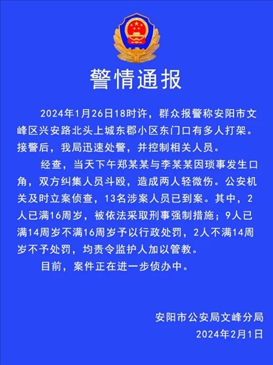 ·河南安陽(yáng)警方通報(bào)一起斗毆案:2人因瑣事爭(zhēng)執(zhí)糾集多人斗毆,13人已到案,其中11人不滿16歲。