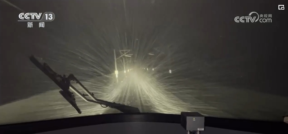 從零時(shí)15分開始到清晨4點(diǎn)多,熱滑除冰車分別駛過(guò)鄭州東、黃河大橋、新鄉(xiāng)和南樂(lè),車窗外白雪皚皚,視線和視野都受到限制。一路上,雨滴和雪粒不斷敲打著車窗,從接觸網(wǎng)上掉落的冰碴,不斷落在車頂上砰砰作響,銅基受電弓在結(jié)冰的接觸網(wǎng)上拉出長(zhǎng)長(zhǎng)的電弧,噼里啪啦電光四射。