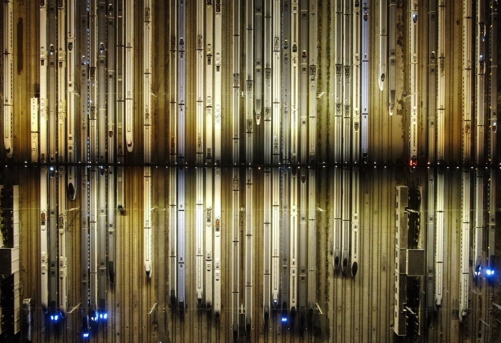 2024年1月26日凌晨,動(dòng)車組列車??吭趶V州動(dòng)車段的存車線上(無人機(jī)照片)。新華社記者 鄧華 攝
