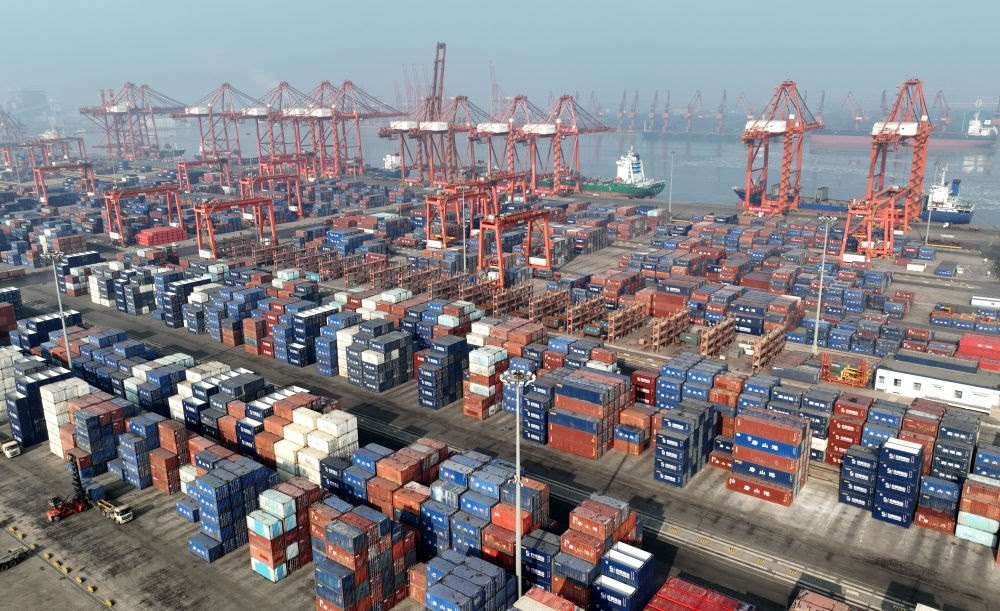 在浙江寧波舟山港梅山港區(qū)碼頭,大型設(shè)備在吊運(yùn)集裝箱(2024年1月24日攝,無人機(jī)照片)。新華社記者 黃宗治 攝