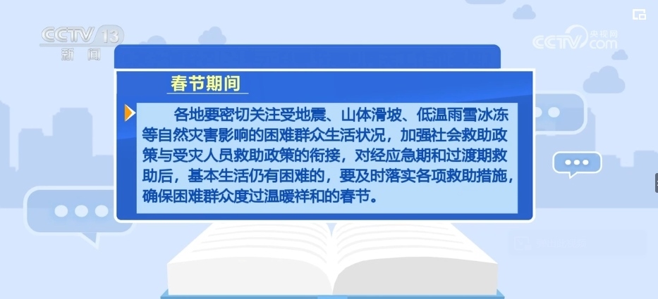 各地要密切關(guān)注受地震、山體滑坡、低溫雨雪冰凍等自然災(zāi)害影響的困難群眾生活狀況,加強社會救助政策與受災(zāi)人員救助政策的銜接,對經(jīng)應(yīng)急期和過渡期救助后,基本生活仍有困難的,要及時落實各項救助措施,確保困難群眾度過溫暖祥和的春節(jié)。