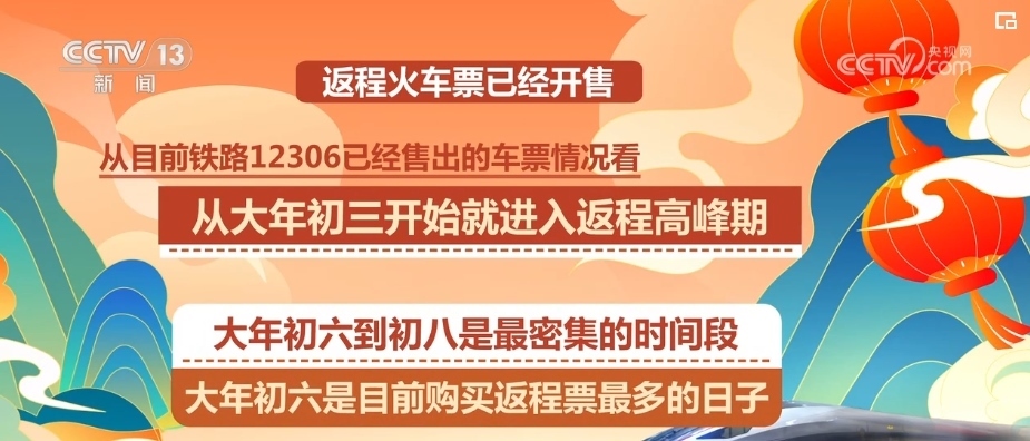 春節(jié)的返程火車票已經(jīng)開(kāi)售,從目前鐵路12306已經(jīng)售出的車票情況看,從大年初三開(kāi)始就進(jìn)入大家返程的高峰期,大年初六到初八是最密集的時(shí)間段,其中,大年初六是目前購(gòu)買返程票最多的日子。