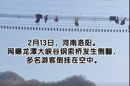 ·洛陽(yáng)一景區(qū)鋼索橋側(cè)翻多名游客倒掛空中。景區(qū):可能游客自己晃動(dòng)導(dǎo)致,已全部救下。