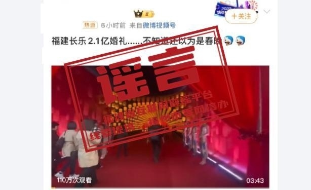 ·福建省互聯(lián)網(wǎng)辟謠平臺(tái):“董事長(zhǎng)之子婚宴斥資2.1億”嚴(yán)重失實(shí),相關(guān)賬號(hào)禁言30日。