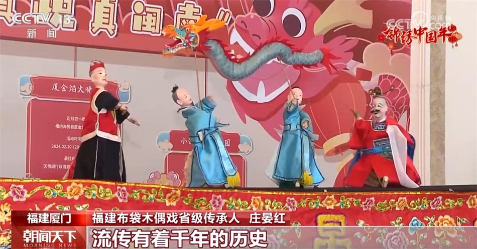 同樣在春節(jié)期間受到游客喜愛的還有廈門的非遺項(xiàng)目布袋木偶。莊晏紅是布袋木偶戲演出團(tuán)隊(duì)的一員,她告訴我們,春節(jié)期間,團(tuán)隊(duì)會(huì)有20多場的演出,忙得熱火朝天,在景區(qū)、酒店、藝術(shù)館為游客展示非遺魅力。