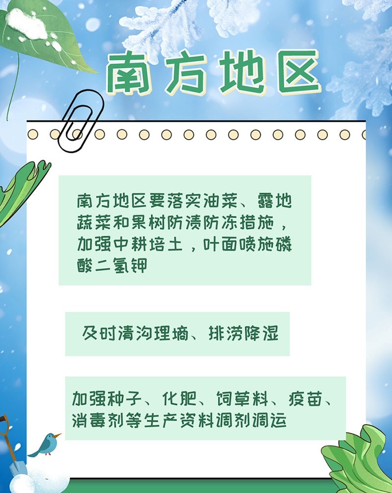 南方地區(qū)要落實(shí)油菜、露地蔬菜和果樹防漬防凍措施,加強(qiáng)中耕培土,葉面噴施磷酸二氫鉀;及時清溝理墑、排澇降濕。加強(qiáng)種子、化肥、飼草料、疫苗、消毒劑等生產(chǎn)資料調(diào)劑調(diào)運(yùn)。