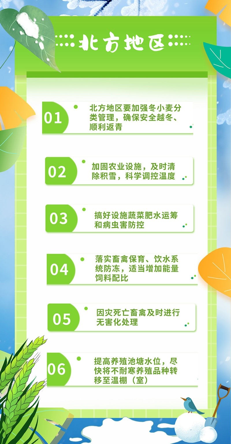 北方地區(qū)要加強(qiáng)冬小麥分類管理,確保安全越冬、順利返青;加固農(nóng)業(yè)設(shè)施,及時清除積雪,科學(xué)調(diào)控溫度;搞好設(shè)施蔬菜肥水運(yùn)籌和病蟲害防控;落實(shí)畜禽保育、飲水系統(tǒng)防凍,適當(dāng)增加能量飼料配比;因?yàn)?zāi)死亡畜禽及時進(jìn)行無害化處理;提高養(yǎng)殖池塘水位,盡快將不耐寒養(yǎng)殖品種轉(zhuǎn)移至溫棚(室)。