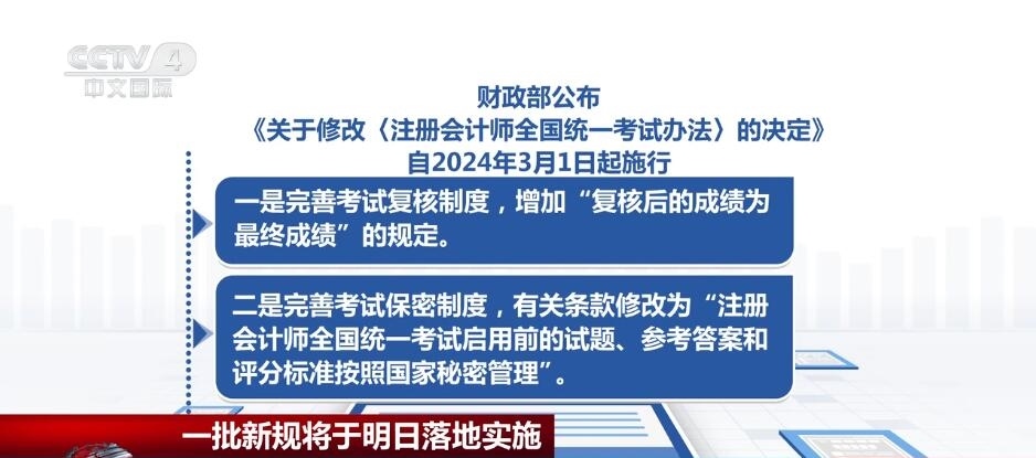 財政部公布《關(guān)于修改〈注冊會計師全國統(tǒng)一考試辦法〉的決定》,自2024年3月1日起施行。《決定》共修改2條。一是完善考試復(fù)核制度,增加“復(fù)核后的成績?yōu)樽罱K成績”的規(guī)定。二是完善考試保密制度,有關(guān)條款修改為“注冊會計師全國統(tǒng)一考試啟用前的試題、參考答案和評分標準按照國家秘密管理”。