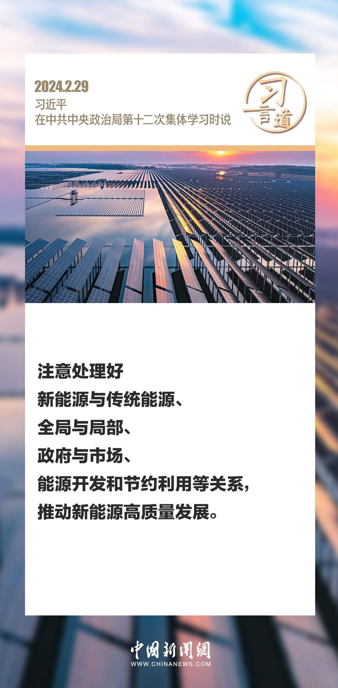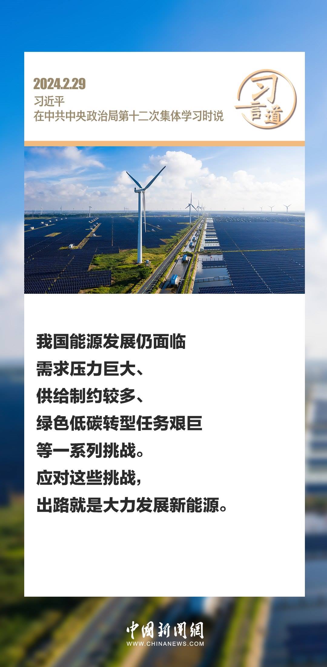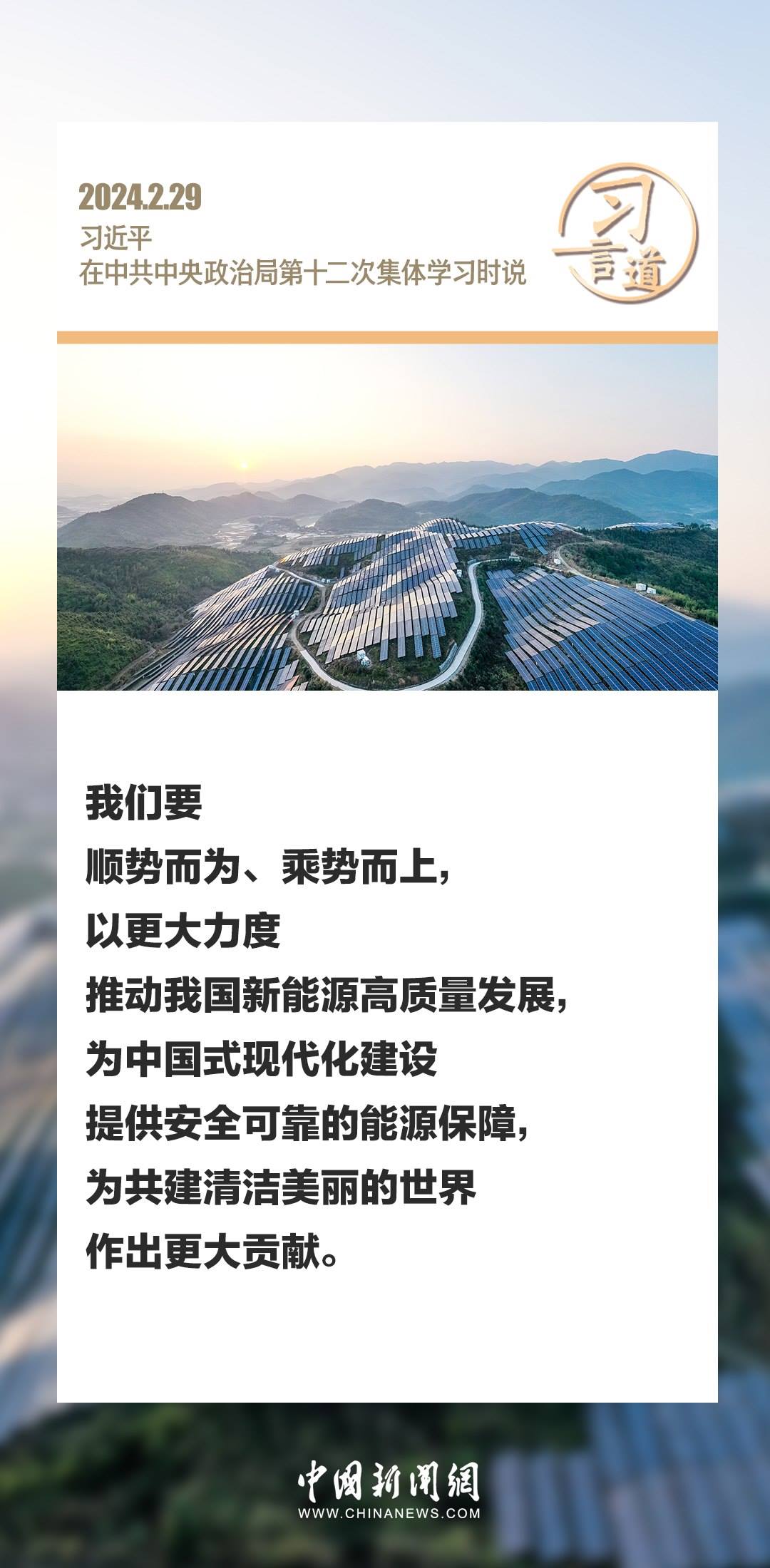中共中央政治局2月29日下午就新能源技術(shù)與我國(guó)的能源安全進(jìn)行第十二次集體學(xué)習(xí)。中共中央總書(shū)記習(xí)近平在主持學(xué)習(xí)時(shí)強(qiáng)調(diào)——