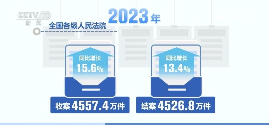 最高人民法院收案21081件,結案17855 件。同比分別增長54.6%、29.5%。全國各級人民法院收案4557.4萬件,結案4526.8萬件,同比分別增長15.6%、13.4%。