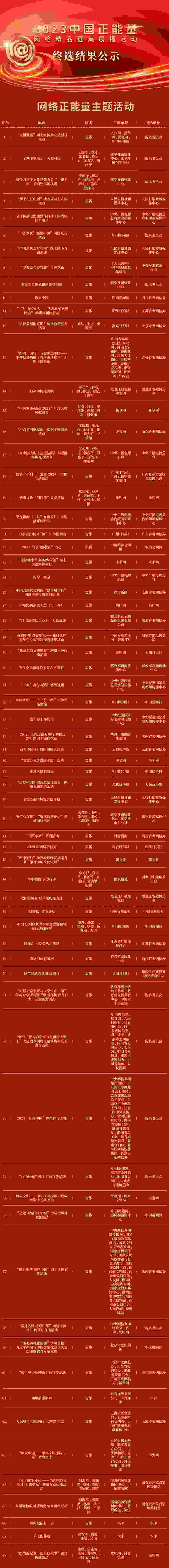 根據(jù)《2023中國(guó)正能量網(wǎng)絡(luò)精品征集展播活動(dòng)規(guī)則》,現(xiàn)對(duì)擬入選作品進(jìn)行公示,公示時(shí)間為3月11日至3月15日,公示期間歡迎社會(huì)各界監(jiān)督評(píng)議,有關(guān)意見可發(fā)送至郵箱zgznl100@cac.gov.cn,公示期滿后將適時(shí)對(duì)外發(fā)布最終結(jié)果,并在線上進(jìn)行集中展播。