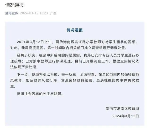 ·廣西通報“小學教師扇打拖拽學生”:屬實,對涉事教師停課處理。