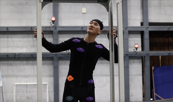 動捕演員身著特定裝備在動捕棚內(nèi)表演。新華社發(fā)