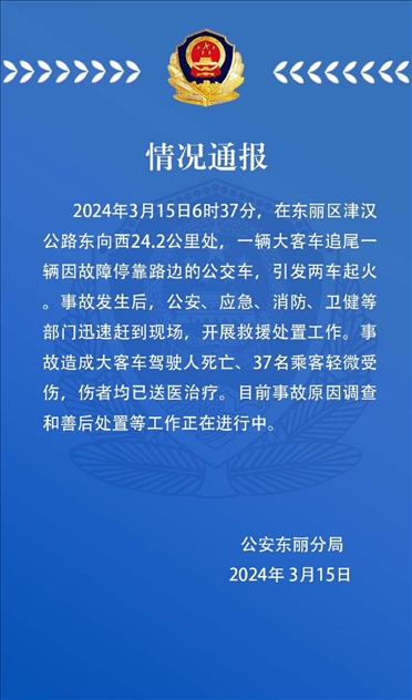·天津一輛大客車追尾一輛因故障??柯愤叺墓卉嚕l(fā)兩車起火,事故造成大客車駕駛?cè)怂劳觥?7名乘客輕微受傷。