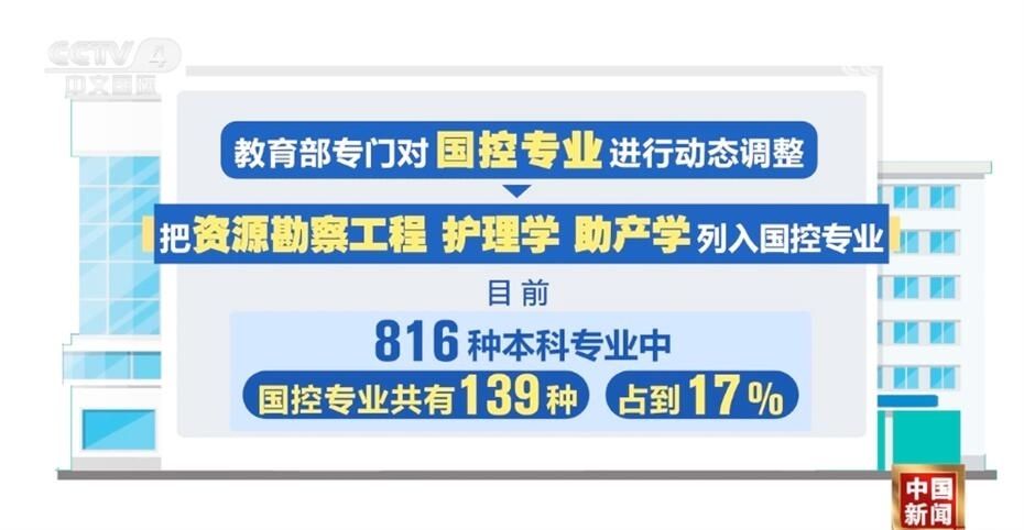 此次教育部專門對國控專業(yè)進行了動態(tài)調整,把資源勘察工程、護理學、助產(chǎn)學列入了國控專業(yè)。目前,816種本科專業(yè)中,國控專業(yè)共有139種,占到17%。未來,國控專業(yè)范圍還將進行“有進有出”的動態(tài)調整。