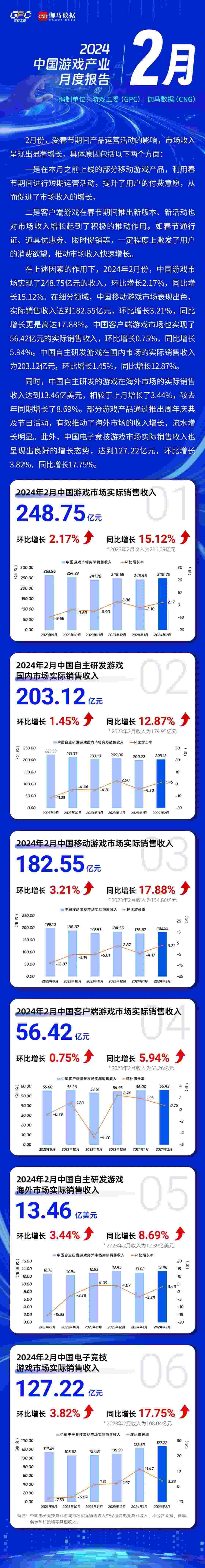 央視網(wǎng)消息:3月20日,據(jù)中國音數(shù)協(xié)游戲工委官微消息,2024年2月中國游戲產業(yè)月度報告發(fā)布。報告顯示,2024年2月份,中國游戲市場實現(xiàn)了248.75億元的收入,環(huán)比增長2.17%,同比增長15.12%。在細分領域,中國移動游戲市場表現(xiàn)出色,實際銷售收入達到182.55億元,環(huán)比增長3.21%,同比增長更是高達17.88%。中國客戶端游戲市場也實現(xiàn)了56.42億元的實際銷售收入,環(huán)比增長0.75%,同比增長5.94%。中國自主研發(fā)游戲在國內市場的實際銷售收入為203.12億元,環(huán)比增長1.45%,同比增長12.87%。